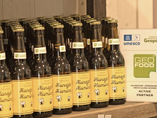 Heikki and Sofia Latvajärvi opened the Meggala winery shop in early summer 2020. As lovers of good wine, food, and celebrations, Heikki and Sofia studied wine production and alcohol manufacturing. Driven by their passion for professional wine production and using local, aromatic, and pure fruits and berries, today they produce high-quality, aromatic, and delicious fruit wines in the heart of the Lauhanvuori-Hämeenkangas UNESCO Global Geopark, in the village of Venesjärvi, Kankaanpää.In the handcrafted Hunaja Humina – honey apple cider, the freshness of local apples from Satakunta combines with the softness of honey collected by bees from the Meggala apple orchard.