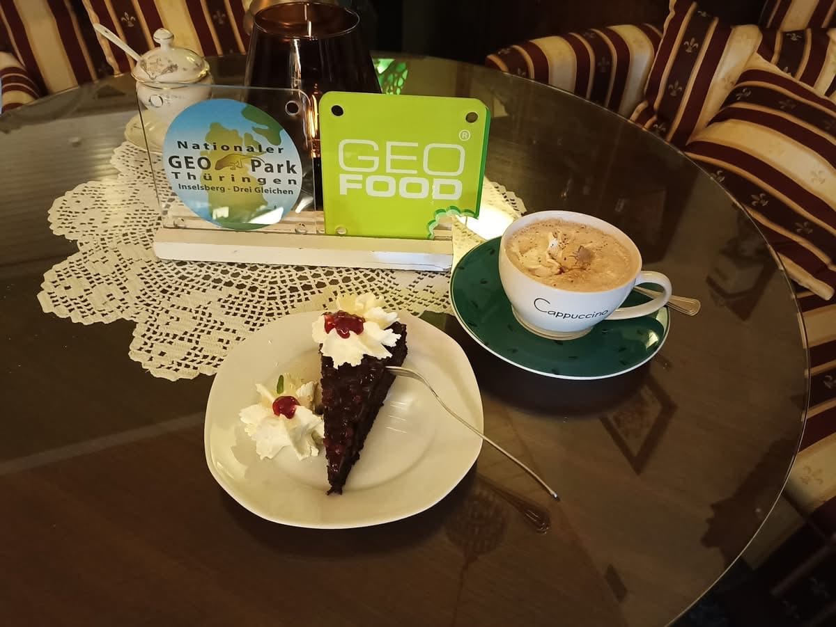 The Mühlencafé Geraberg is a special place where enjoyment, history, and geology come together in a unique way. Daniela Wiegand’s café is located in the historic Braunsteinmühle (Manganese ore mill), an important testament to the region’s economic and industrial history, where manganese ore was processed until 1982 and which is the only surviving manganese ore mill in European Union. An exhibition in the building invites visitors to learn more about the geological foundations of the region, the historical mining of manganese, and the use of hydropower along the tame Gera River. For this purpose, a water turbine, ore grinding mills, and a historical stamp mill have been restored, giving visitors the opportunity to gain insight into local manganese ore mining. A unique café concept has been realized in this extraordinary location. The premises, individually designed by Daniela Wiegand, offer a variety of experiences and invite guests to leave everyday life behind for a moment. With great attention to detail, a special and seasonal atmosphere is created in which guests feel welcome and can relax. Special attention is paid to the use of regional products: many of the cakes and tarts on offer are made with flour from grain grown in the geopark and its immediate surroundings. This creates a close connection between culinary enjoyment, regional agriculture, and the cultural landscape of the Geopark.