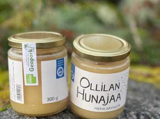 Ollila’s Honey Farm’s honey is a good example of local food, handcrafted without heating and made primarily from organic ingredients. The main honey harvest is usually collected at the end of July from hives placed around Merikarvia. The farm’s bees fly from flower to flower, gathering nectar, which is then brought back to the hives and transformed into honey. Once the honey is harvested and processed, it is hand-packed, ready to be enjoyed on its own or used in a variety of dishes. Sustainable and responsible honey production contributes to biodiversity in the Lauhanvuori-Hämeenkangas Geopark area. Geopark’s diverse nature, including forests, river valleys, fertile fields, meadows, and roadside verges, provides an excellent habitat for bees. Thick soil layers and minerals ground from the granite bedrock during the continental glacier period create optimal growing conditions for the flowering plants from which the bees collect the nectar. The region’s clean, natural climate and thriving plants are reflected in the taste of honey from Ollila’s Honey Farm.